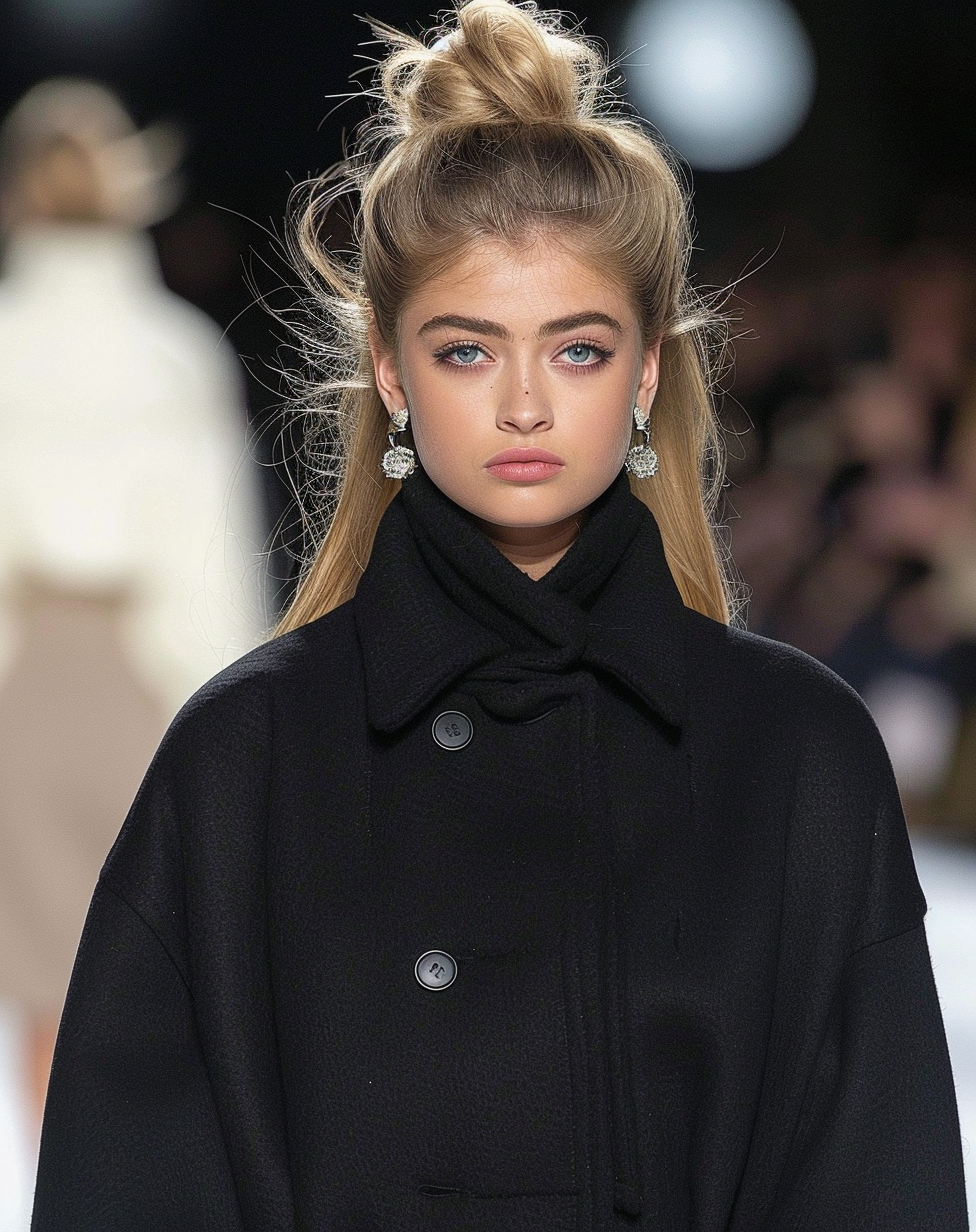 AI model wearing coat on catwalk